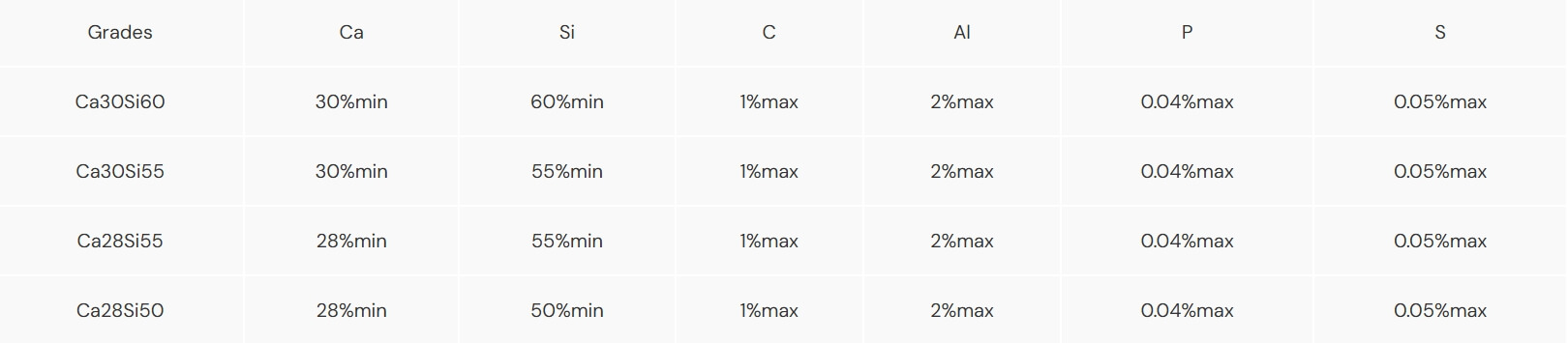 The main components of silicon calcium alloy are silicon and calcium, and different amounts of impurities such as Fe, Al, C, S, P etc. Calcium has a strong affinity with oxygen, sulfur, hydrogen, nitrogen and carbon in molten steel. So, silicon calcium alloys are usually used as a deoxidizer and desulfurizer.