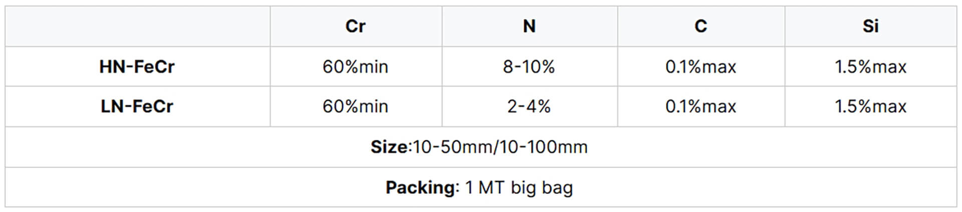 Ferro Chrome Nitride: FeNCr10-B Cr≥60% N≥5.0% C≤0.1% S≤1.5%.